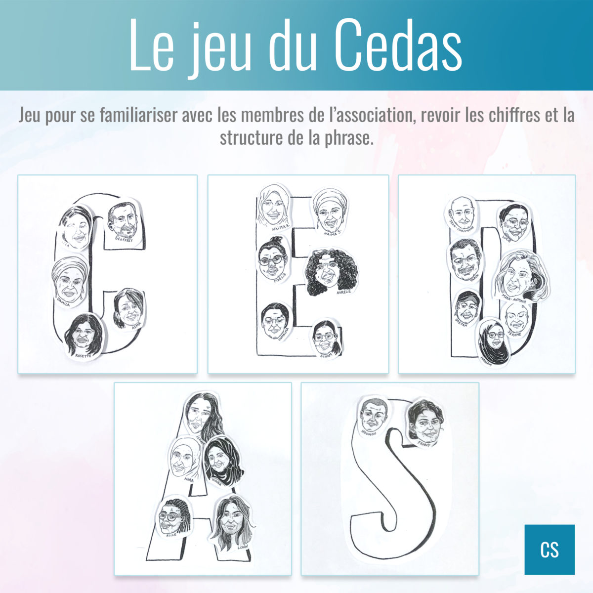 Le jeu est présenté sur un panneau sur lequel on peut fixer les portraits selon les règles du jeu. Cet outil pédagogique permet faire connaître les membres du Cedas, de réviser les chiffres, à l’oral comme à l’écrit, et de pratiquer la formulation de phrases affirmatives et interrogatives.